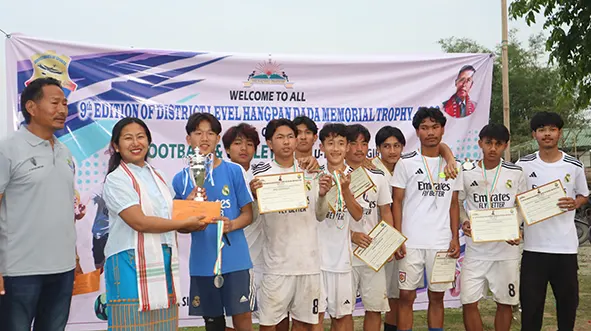 Likabali ZPM Karbi Nyodu Taipodia, District Football Association president Dochi Riram, District Sports Officer Ajok Sitek, and organising secretary Monya Dini were present during the prize distribution ceremony held here on Friday. (DIPRO)
